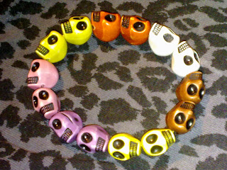 Durante todo el verano he visto las pulseras con calaveras de colores y me moría de ganas de hacerme una, pero no encontraba las cuentas en ningún sitio. pero he encontrado unas pocas y he hecho algunas combinaciones, mi idea es hacerlas yo en fimo en breve con un molde, a ver como me quedan...! mientras os enseño estas, espero que os gusten: