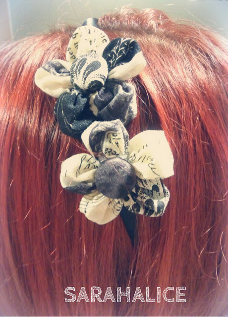 Se trata de una bonita diadema forrada en color negro, con dos flores de tela con pétalos diferentes los unos de los otros, ya que hemos ido seleccionando trozos con diferente estampado para hacerla aun mas única. El centro es un botón forrado por nosotros de la misma tela.